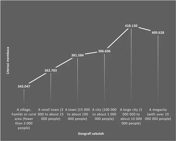 Konsisten dengan temuan sebelumnya, murid-murid yang berada di sekolah dengan kategori village, hamlet or rural area adalah kelompok yang memperoleh skor paling rendah pada uji literasi membaca. Kelompok ini hanya memperoleh skor 343,05 (level 1a).
