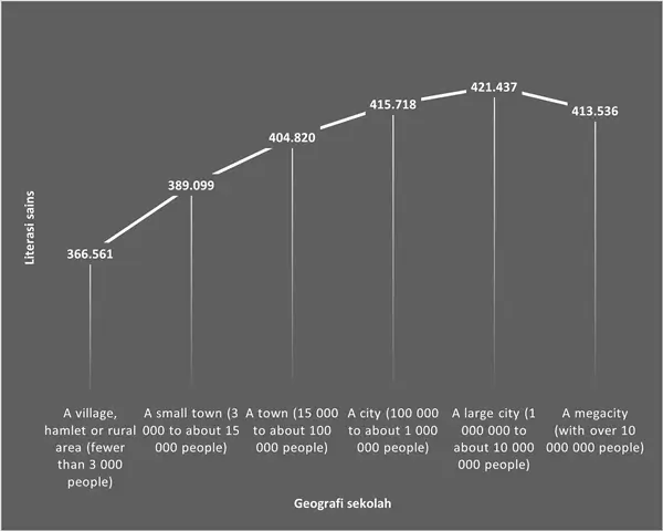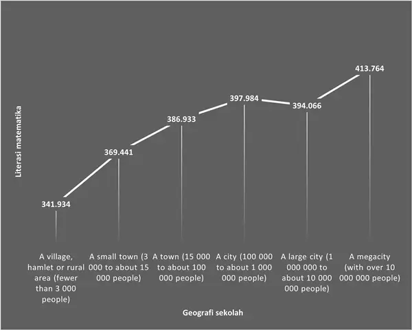 Berdasarkan grafik 1 di atas, kelompok geografi sekolah yang paling rendah pada literasi matematika adalah sekolah-sekolah yang termasuk pada kategori village, hamlet or rural area (daerah pedesaan berpenduduk kurang dari 3.000 jiwa) dengan skor 341,94. Skor ini berada di level 1b atau di bawah level 2, yang dianggap sebagai kecakapan minimum.