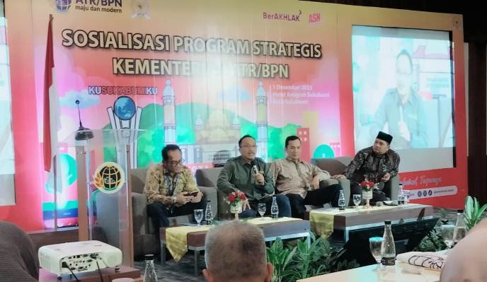 Salahsatu langkahnya dengan menggelar Sosialisasi Program Strategis Kementrian ATR/BPN yang dilaksanakan di Ballroom Hotel Anugerah, Jalan Suryakencan, Kota Sukabumi, Jum’at (1/12/2023).